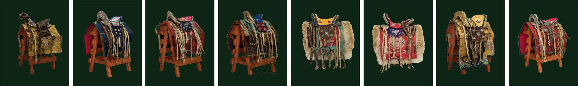 从左至右:喇嘛鞍、王爷鞍、福晋鞍、台吉鞍、蒙元鞍、鲜卑鞍、蒙元鞍、契丹鞍